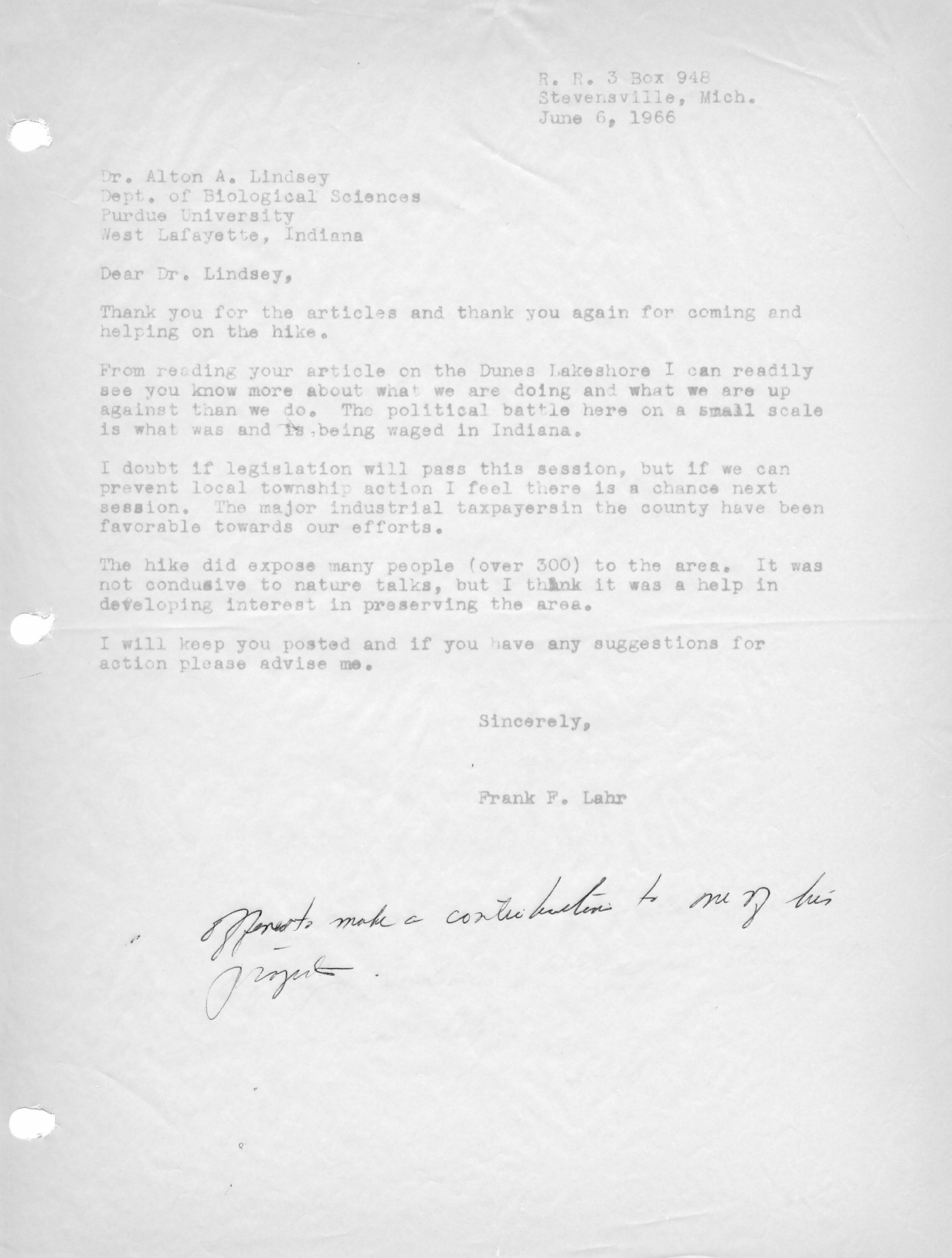 Original letter from Frank Lahr to Dr. Alton A. Lindsay, Department of Biological Science, Purdue University