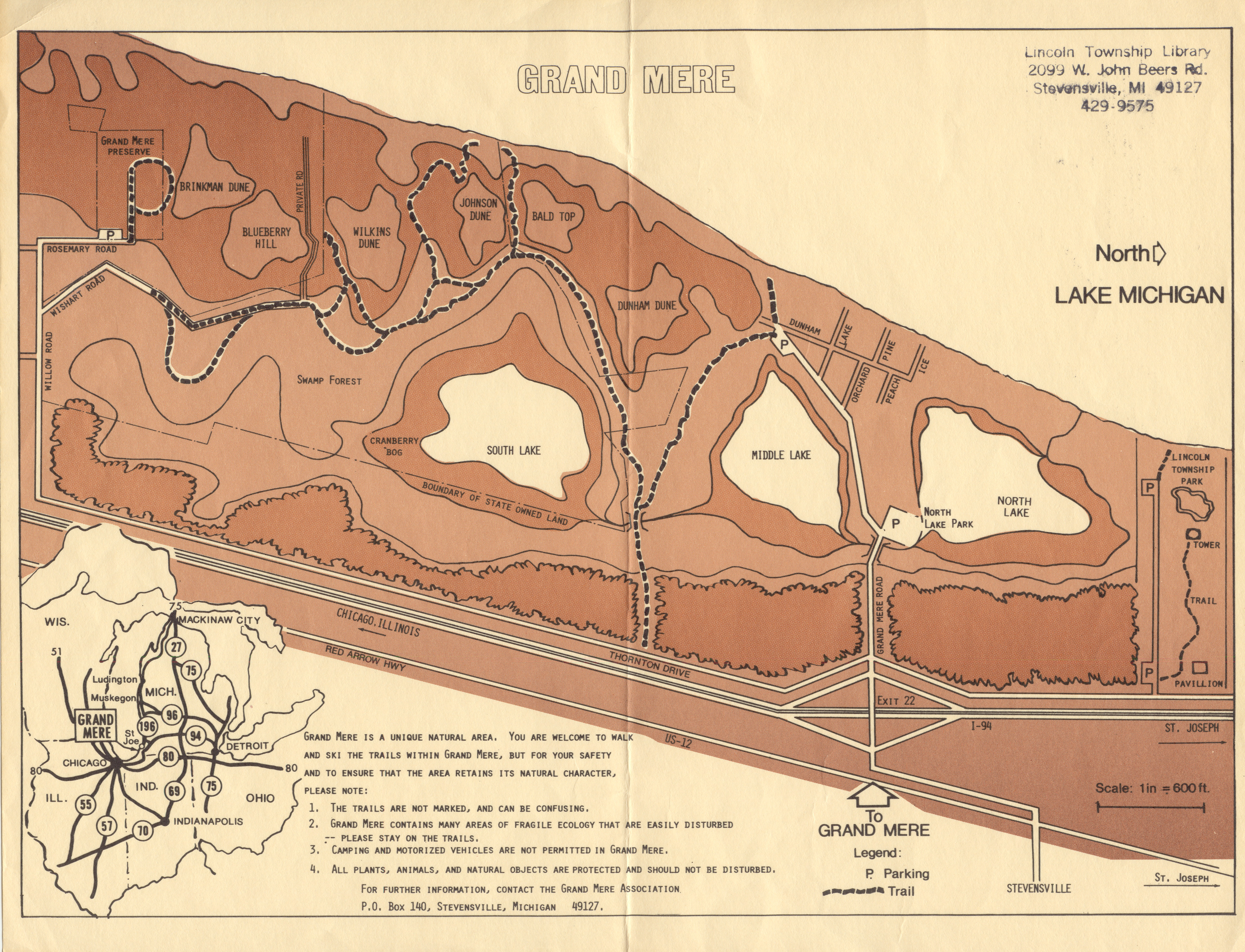 Map showing hiking trails through Grand Mere, and location of park