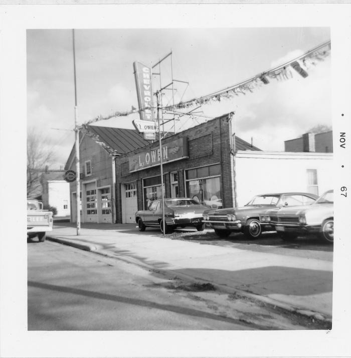 Village of Ortonville Chevrolet Dealership. 3 1/2x3 1/2 black and white photographic print.