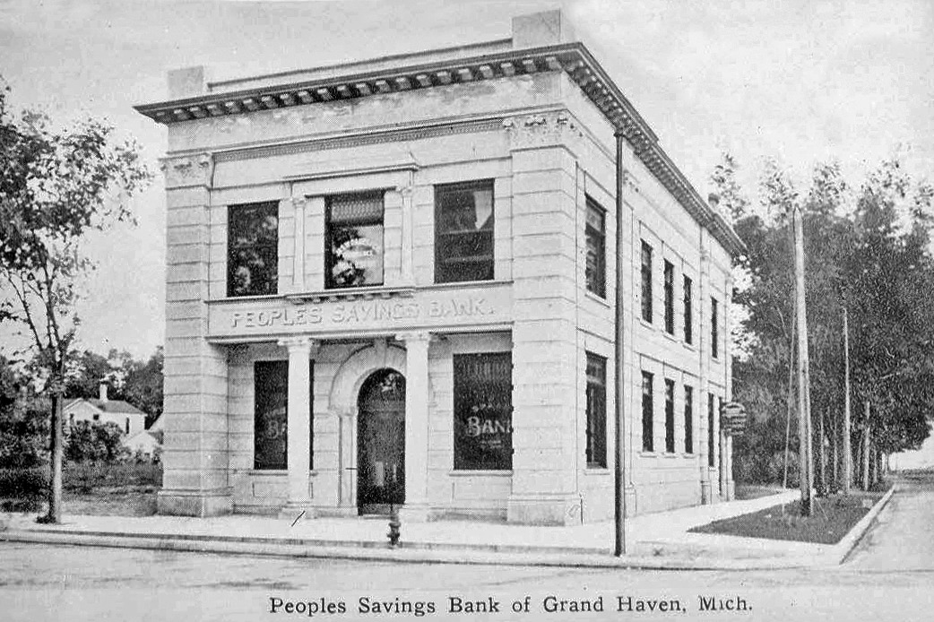 Black and white photograph of the Peoples Savings Bank, located on the southeast corner of Washington Ave. and Third St. Grand Haven, Michigan.