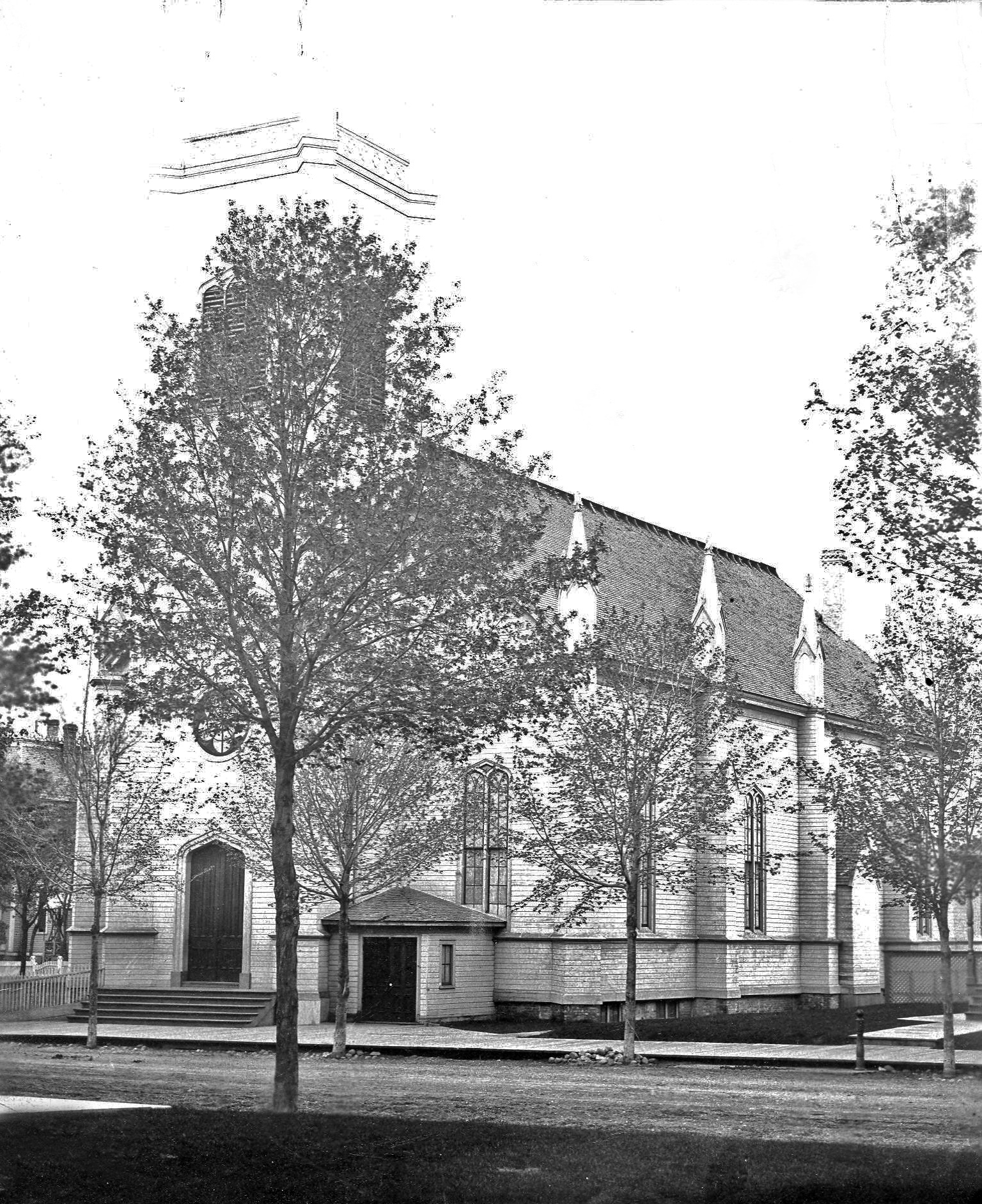 Known as "the Church of Many Towers", this was the third building to serve the congregation, which was organized in 1851. The structure pictured was dedicated in 1870 and burned during the great fire of 1889. Two more churches were built in the same place on Washington Street and also burned. Their sixth building, also on this site, was built in 1914 and serves to the present day.