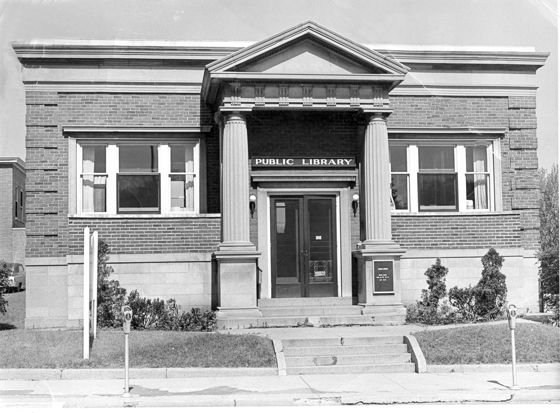 Black and white photograph of the front of the original Carnegie library, built in 1913, located on the northeast corner of Washington Ave. and Third St. Grand Haven, Miichigan.