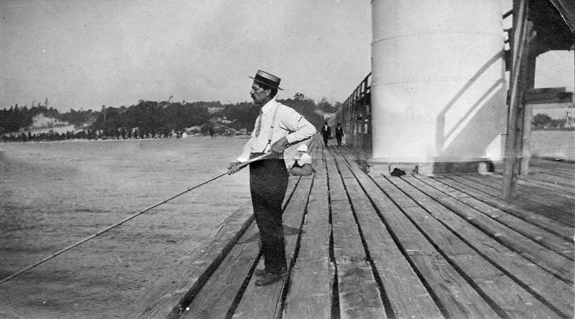Black and white photo of a man in a straw hat fishing from the north side of the south pier at Grand Haven, Michigan. Dewey Hill can be seen in the background.