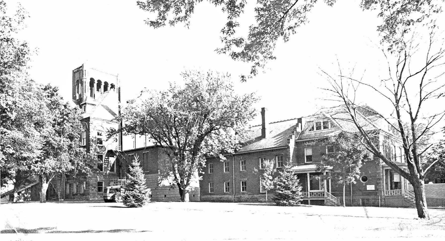 Black and white photo of the Ottawa County Courthouse (left) and Jail (right), built in 1894 and 1898, respectively in Grand Haven, Michigan. Both were raised in 1965.