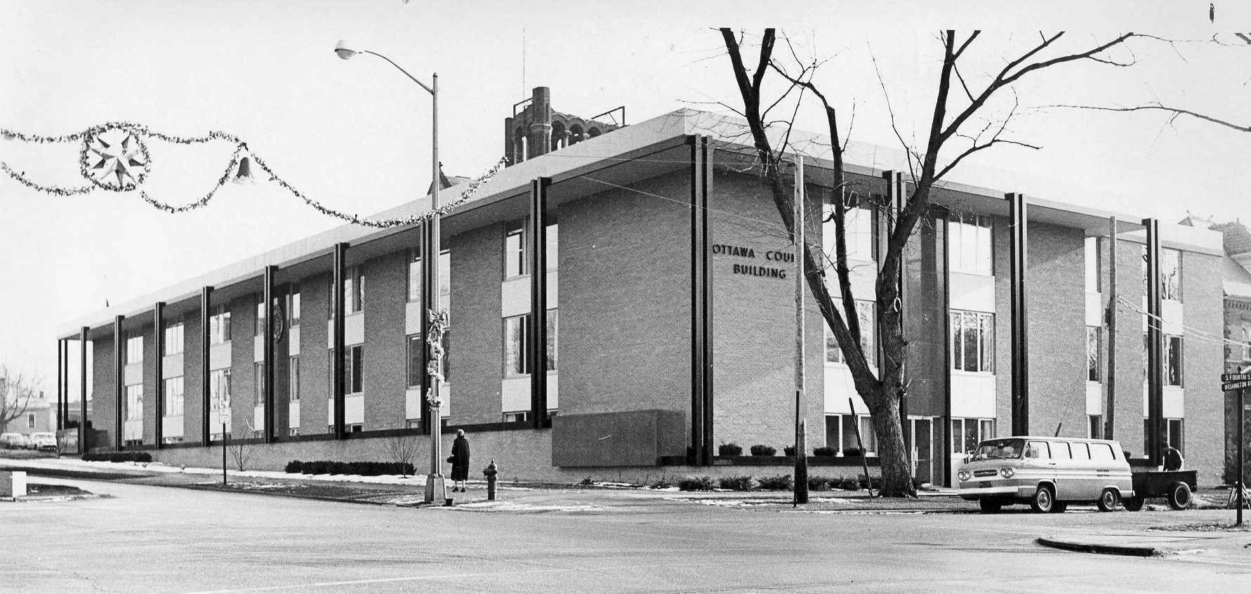 Black and white photo of the 1965 Ottawa County Building in Grand Haven, Michigan at Christmas time. The demolition of the earlier courthouse tower is in view behind it.