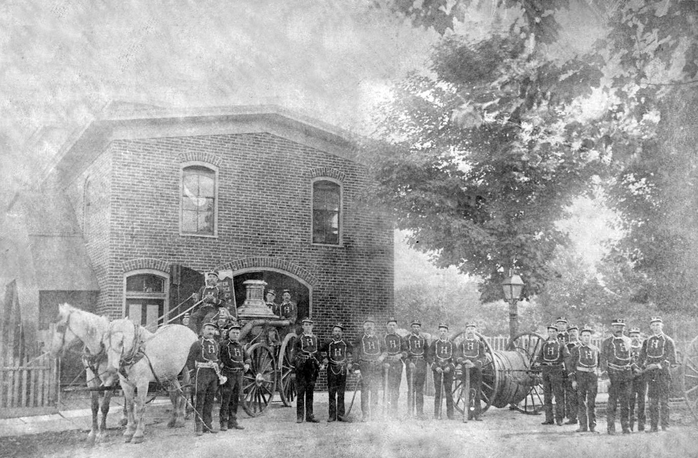 Black and white photo of Spring Lake, Michigan fire fighters and horse-drawn fire wagon.