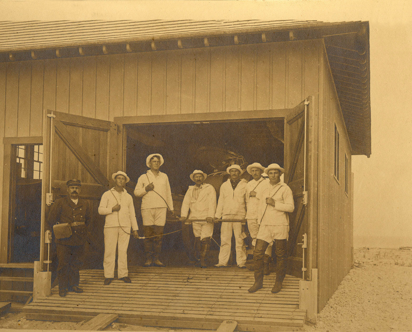 Sepia photo of lifesavers at the Sleeping Bear Dunes Lifesaving Station.