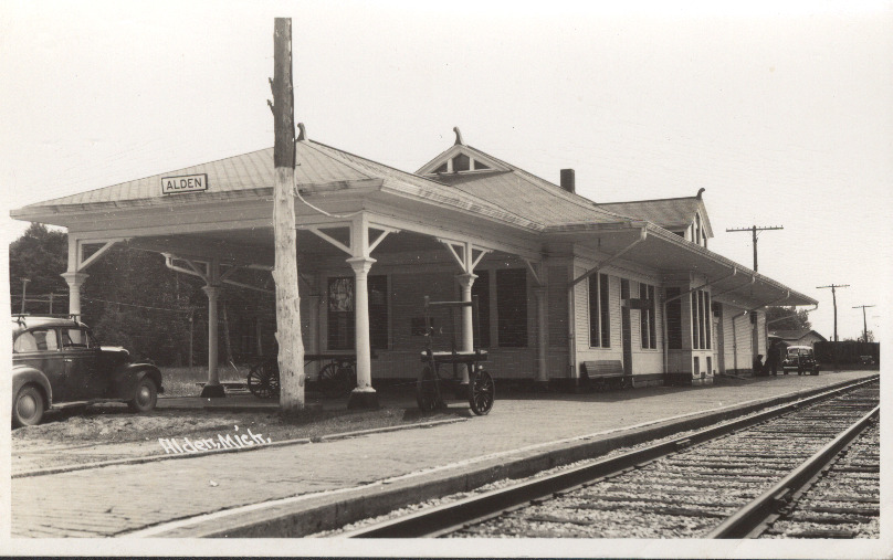 Black and white postcard of depot, Alden, Michigan, ca. 1935, with automobiles parked near it.
