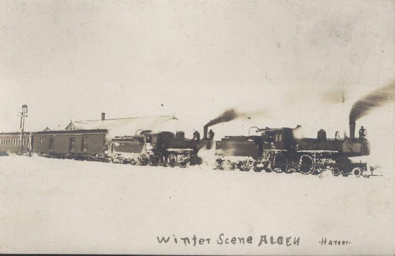 Black and white postcard of train with two steam engines in front of Alden Depot in snow, Alden, Michigan, ca. 1910