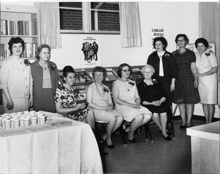 Library Open House L to R: Anne Tucker, Myrtle Boutell, Esther Jaruga, Esther Medlen, Arlene Pipi, Florence Skinner, Joann Wilcox, Margarete Metzger, Dorothy Grovesteen
