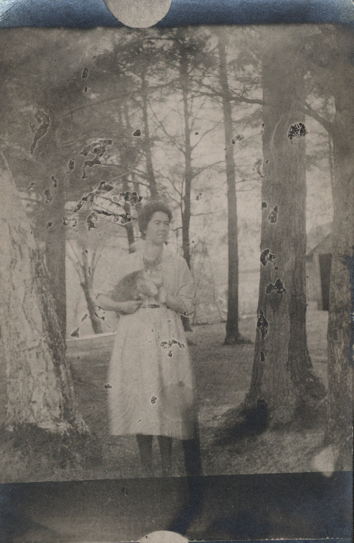 Black and white postcard of Edna Parks Angell as young woman, standing holding cat beneath trees, ca. 1920 (image somewhat damaged)