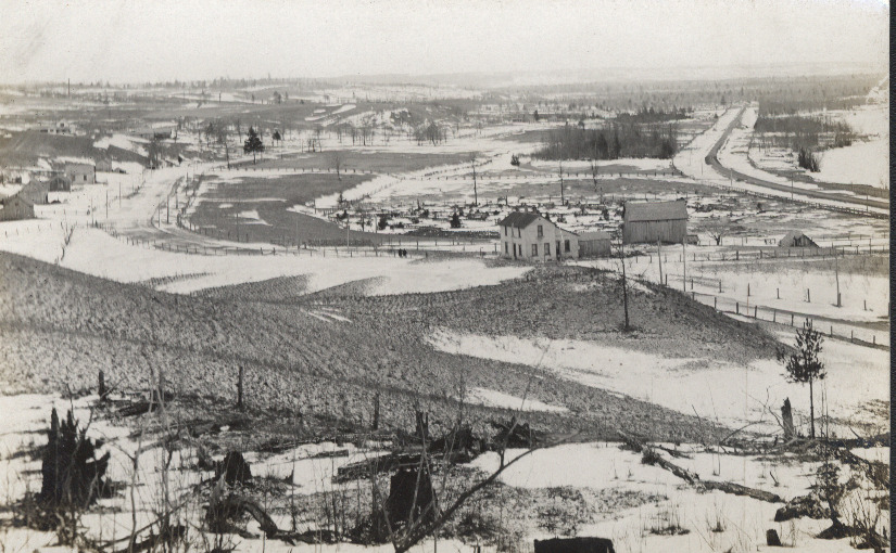 Black and white postcard of Alden, Michigan in winter, with farm in midground, 1900~.