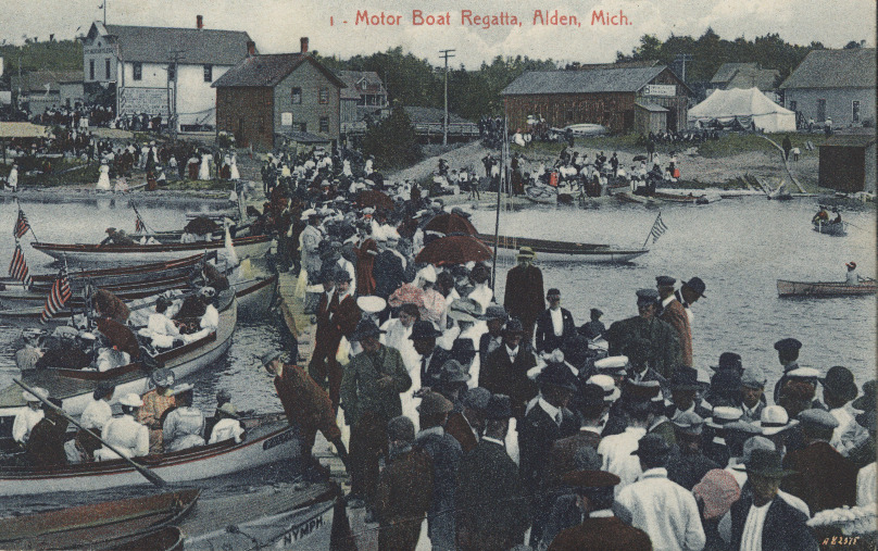 Color postcard of dock scene, Motor Boat Regatta, Alden, Michigan, ca. 1910