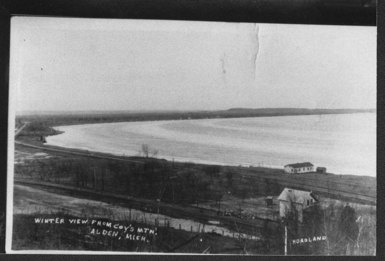 Black and white postcard of winter view of Helena Street, Alden Michigan, ca.1900
