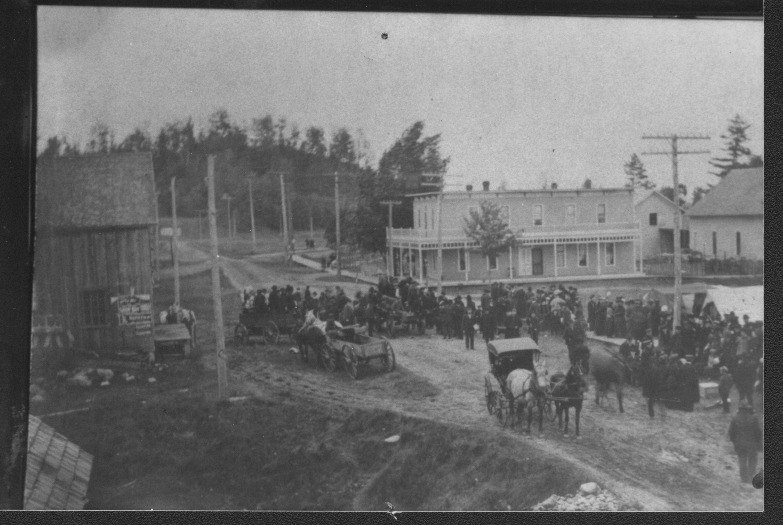 Black and white photo of Main Street with horse and buggies, Alden, Michigan ca. 1900.