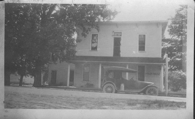 Black and white photo of Main House, with automobile of the period parked in front, Alden, Michigan ca. 1930.