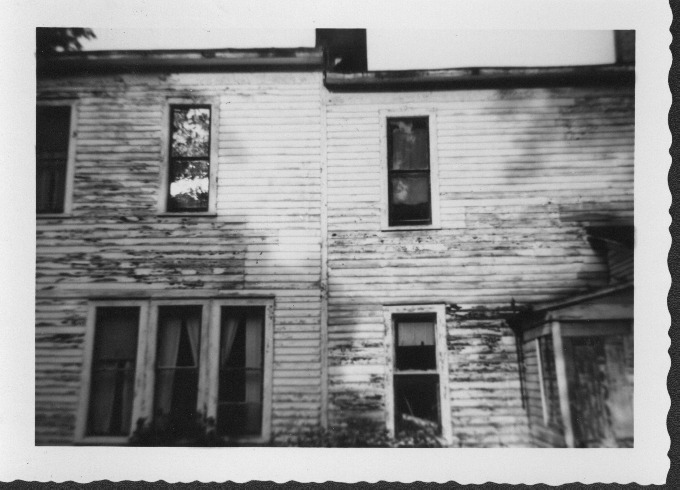 Black and white photo of Main Hotel, south side, in disrepair, Alden, Michigan ca.1955.