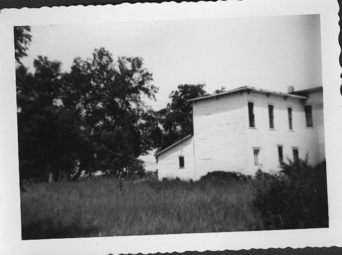 Black and white photo of SW side Main Hotel in disrepair, Alden, Michigan ca.1955.