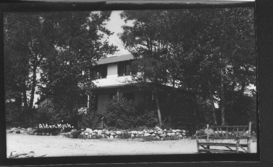 Black and white photo of Winifred Burnett's cottage on Sandy Beach at Balmy Brook, Alden, Michigan ca.1940.