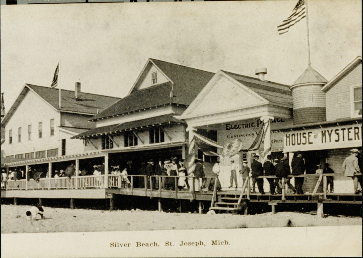 A panorama showing four of the midway structures. Well dressed visitors are crowded onto the walkway. Note "House of Mysteries" at right side of photo.