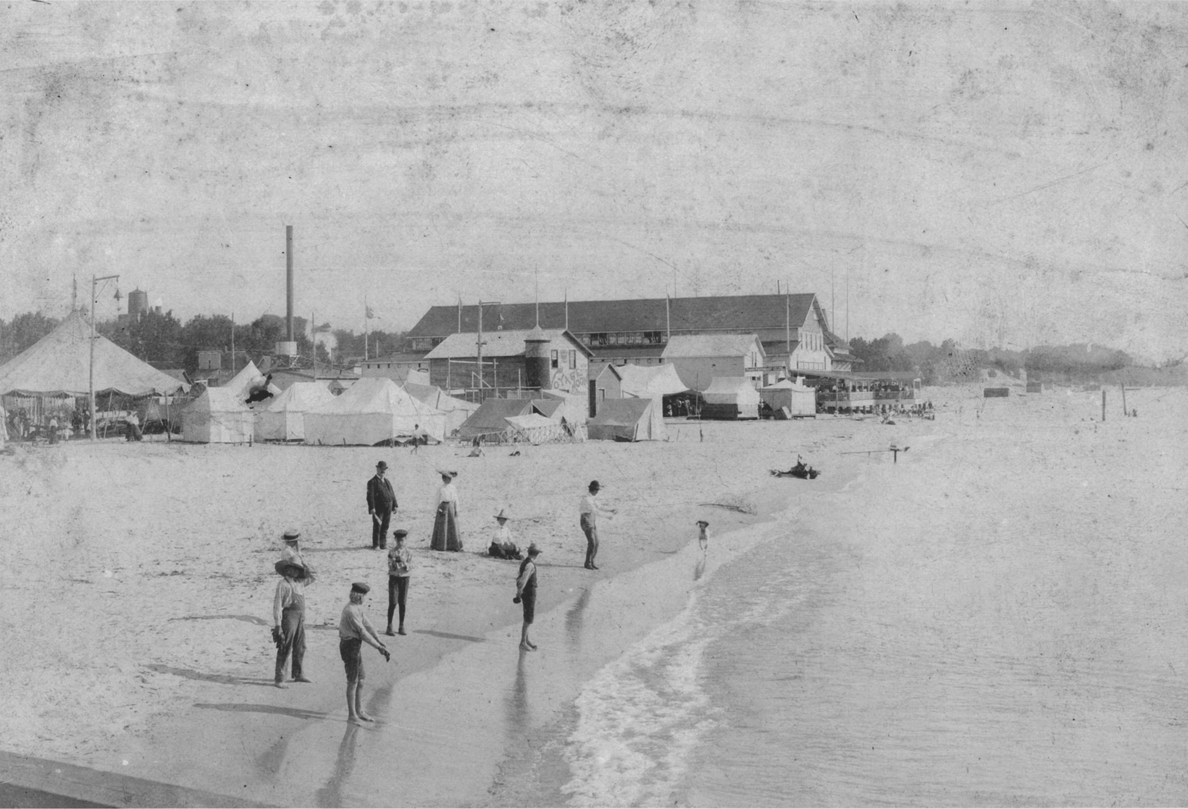 Boys and their dog stand near the water, a man and wife stand behind them. Towards the back of the photo are some of the midway tents (walk is behind them, not in view). The large building at the back is the original gas lit ballroom.