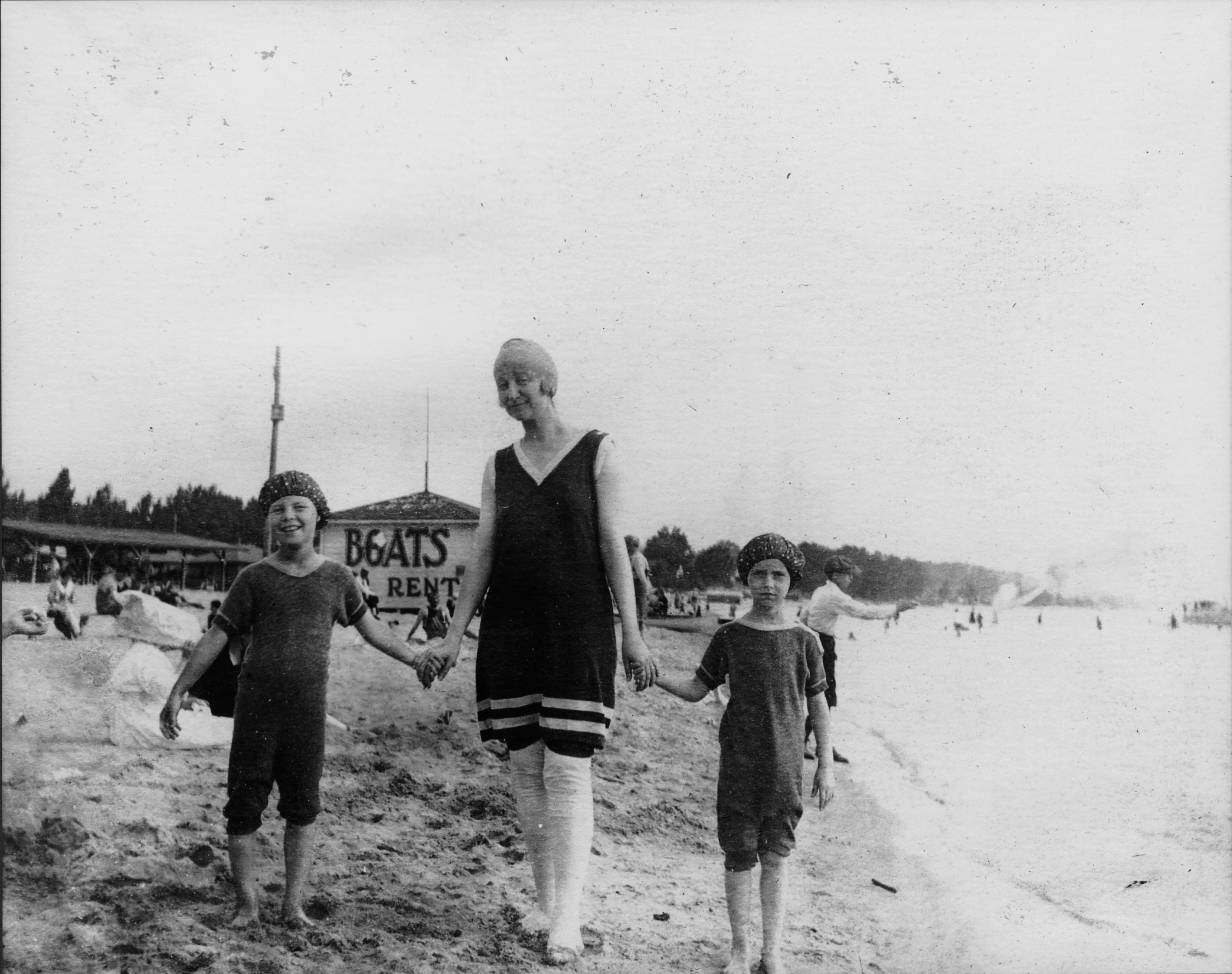 A mother and her two children, all in bathing suits, pose for a photo. Note boat rental in the background and Lake Michigan at the right.