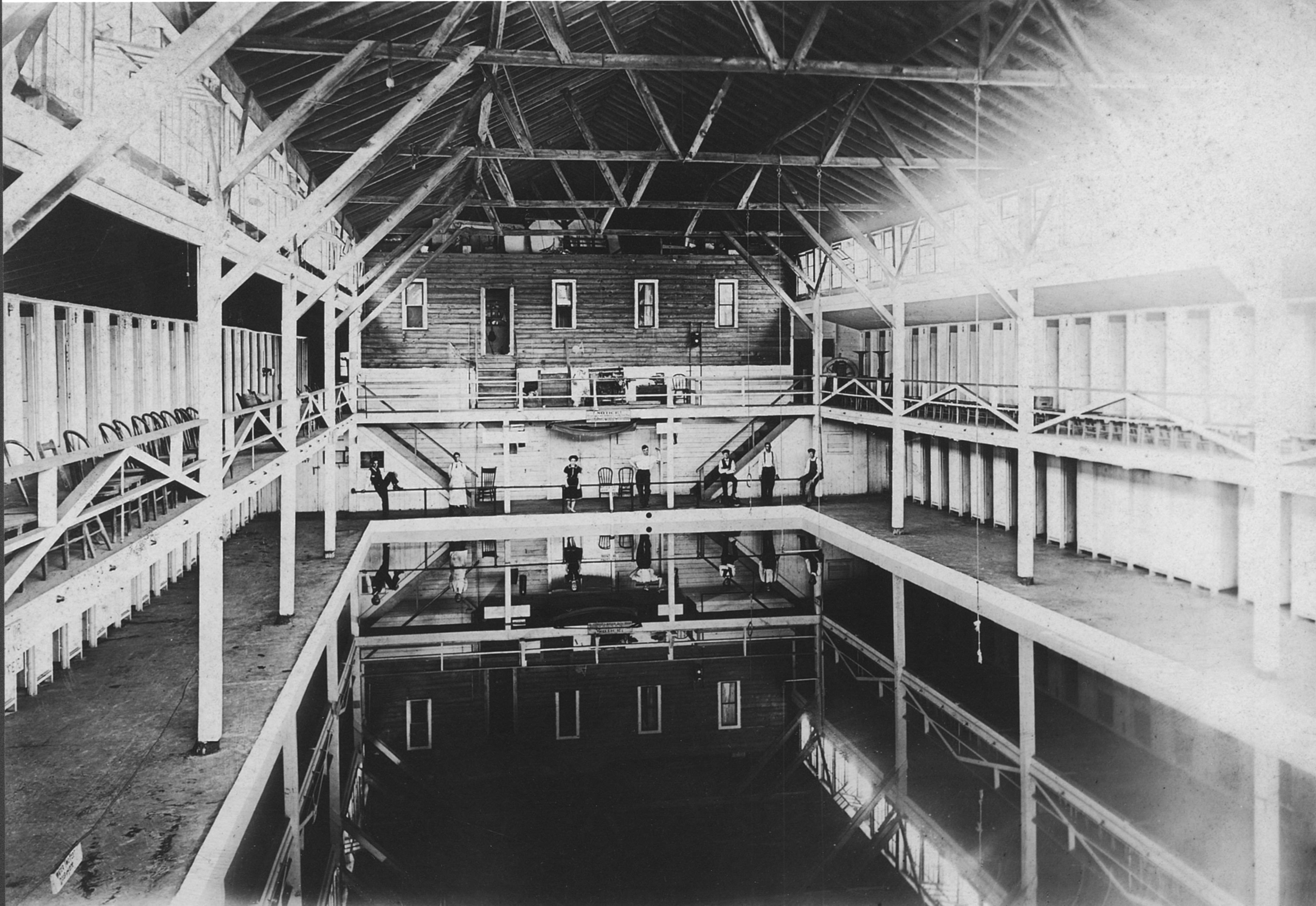 The indoor natatorium at Silver Beach was 210 feet long and 70 feet wide. Depth of the poor varied from 3 feet to 5-1/2 feet. The pool was filled with water from Lake Michigan that was heated by a steam furnace. Skylights let in sunlight for additional heating. Bathing suits, shores, towels, and hats were available for rent.