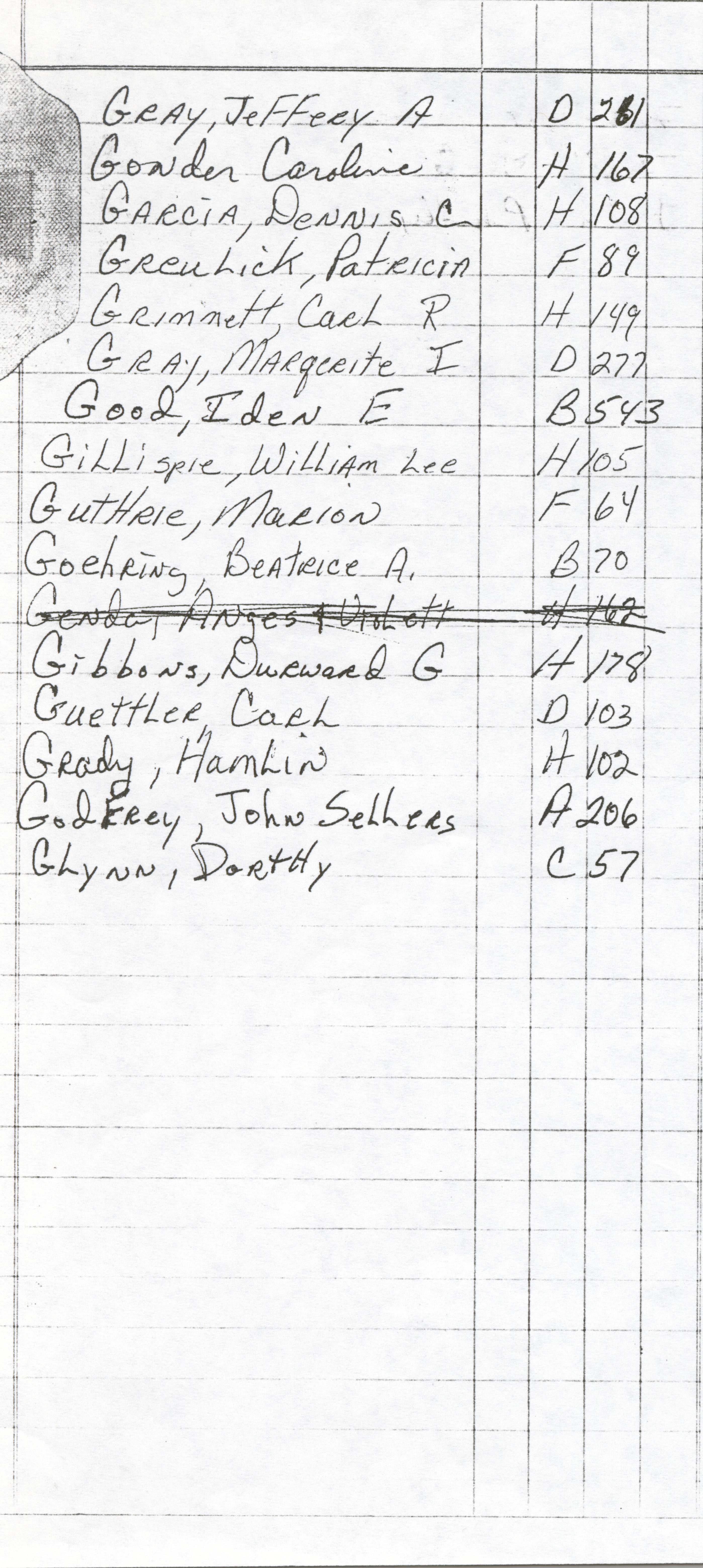Part 1: Jeffrey Gray, Caroline Gonder, Dennis Garcia, Patricia Greulick, Carl Grimmett, Margerite Gray, Iden Good, William Gillispie, Marion Guthrie, Beatrice Goehring, Durward Gibbons, Carl Guettler, Hamlin Grady, John Godfrey, Dorthy Glynn.