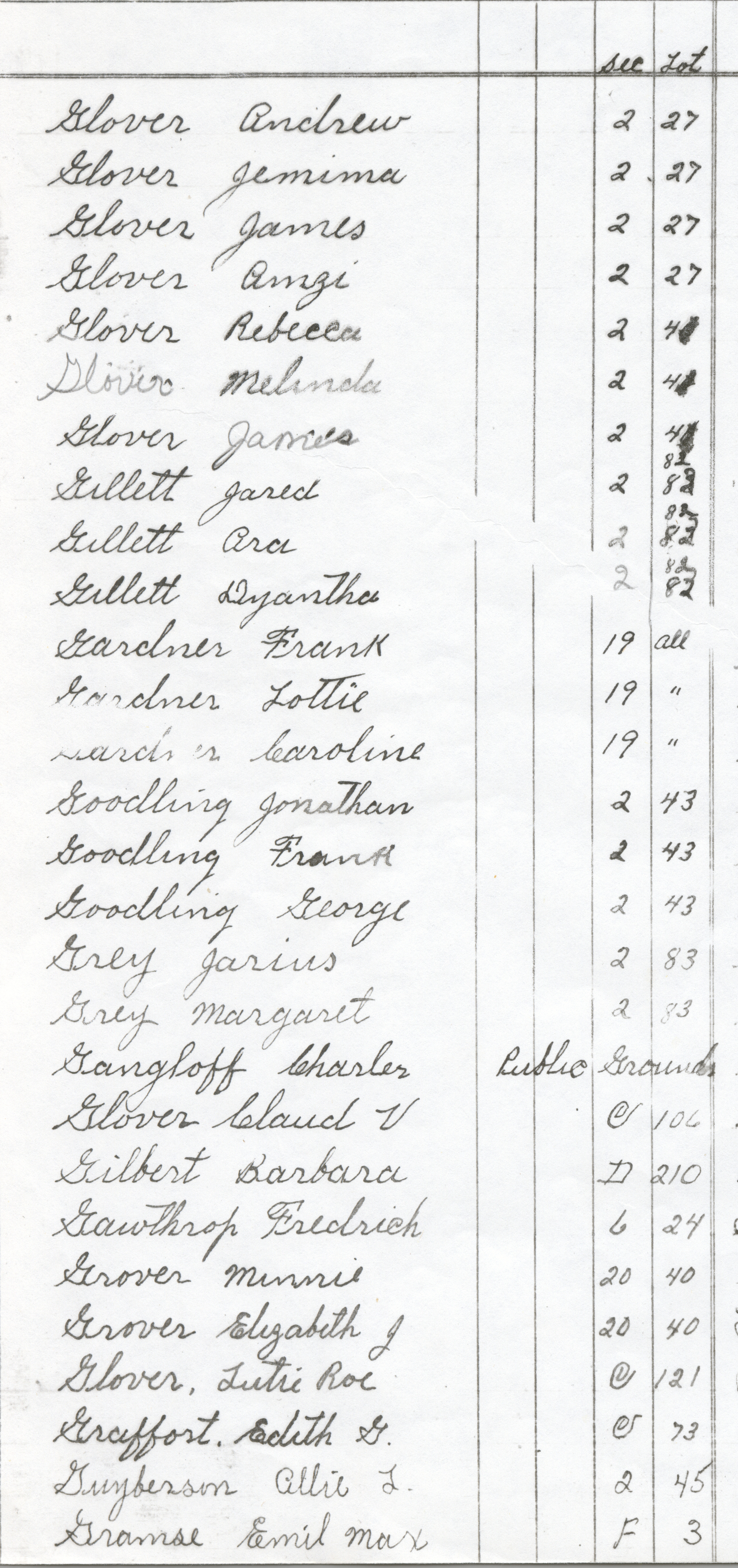 Part 1: Andrew Glover, Jemima Glover, James Glover, Amzi Glover, Rebecca Glover, Melinda Glover, James Glover, Jared Gillett, Ara Gillett, Dyantha Gillett, Frank Gardner, Lottie Gardner, Caroline Gardner, Jonathan Goodling, Frank Goodling, George Goodling, Jarius Grey, Margaret Grey, Charles Gangloff, Claud Glover, Barbara Gilbert, Fredrick Gawthrop, Minnie Grover, Elizabeth Grover, Lutie Glover, Edith Graffort, Allie Guyberson, Emil Gramse. Part 2: Almira Gosline, Caroline Gosline, Peter Gosline, Charles Gosline, Harry Gosline, Henry Grice, Katherine Galleger, James Gray, Wm Gregson, Harold Good, Rufus Giver, Jay Glover, Bernard Groce, Jack Green, Albert Green, Minnie Glover, Stephen Gladswish, Joseph Godfrey, Fred Gonder, Annie Gibson, Cleatus Green, Jessie Gowland, James Glover, Martha Graffort, Baby Boy Green, Ella Gaul, Michael Gaul, Jeffery Grooms. Part 3: Mary Gunner, Phay Graffort, Clara Gonder, Emma Graham, Bernice Glossenger, Dora Gowen, Anna Gelb, Zelphia Gilbert, Chester Gilmore, Mary Grimes, Elma Grundhofer, Don Graffort, Robert Grant, Martin Gilbert, Willie Gilmore, Everett Geary, Alfred Gaul, John Giver, Ora Gabbert, James Gowen, Timothy Grun, Maude Gosline, Clayburn Goach, Helen Garmire, Lawrence Green, Ralph Gosline, Ernestine Gombosi, Geneva Groves.