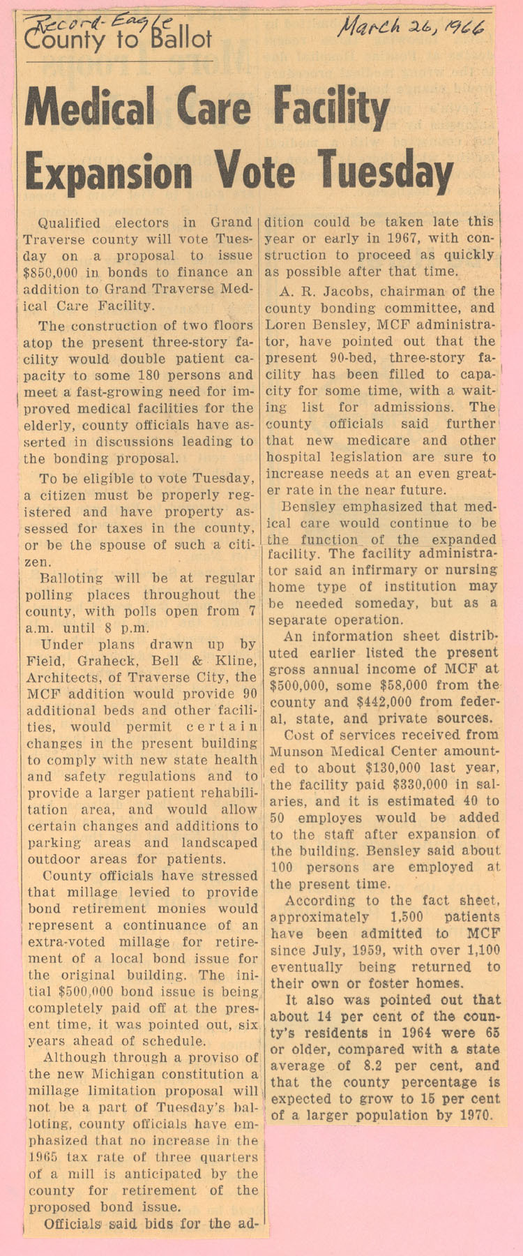 Newspaper article. Addition of two floors atop the current three-story facility is proposed. Grand Traverse County medical care facility requests funding for 90 new beds.