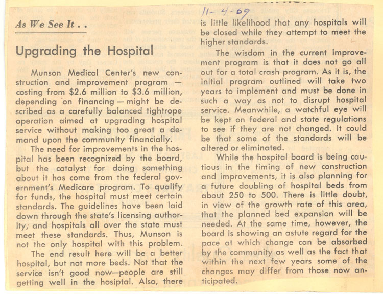 Newspaper editorial piece. Financing for a carefully balanced tightrope operation aimed at upgrading hospital service. Federal Medicare program requires hospital improvements.