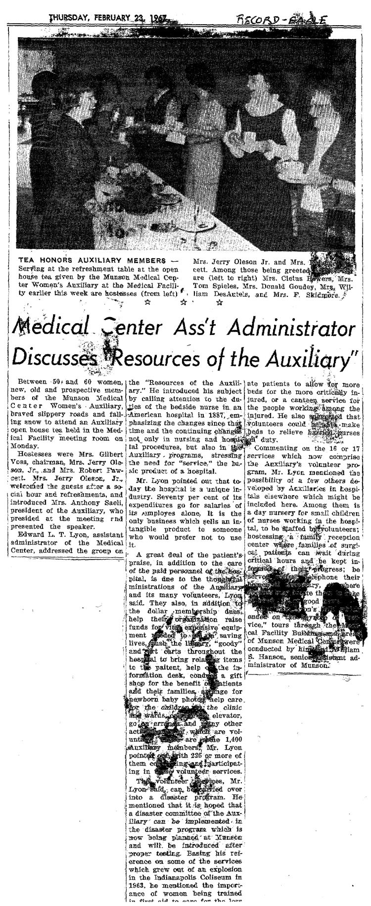 Newspaper article with photograph of hostesses (from left) Mrs. Jerry Oleson Jr.and Mrs. Robert Fawcett. Among those being greeted at the Annual Open House Tea are (left to right) Mrs. Cletus Bowers, Mrs. Tom Spieles, Mrs. Donald Goudey, Mrs. William DesAutels, and Mrs. F. Skidmore. 1,400 auxiliary members offer 225 volunteers.