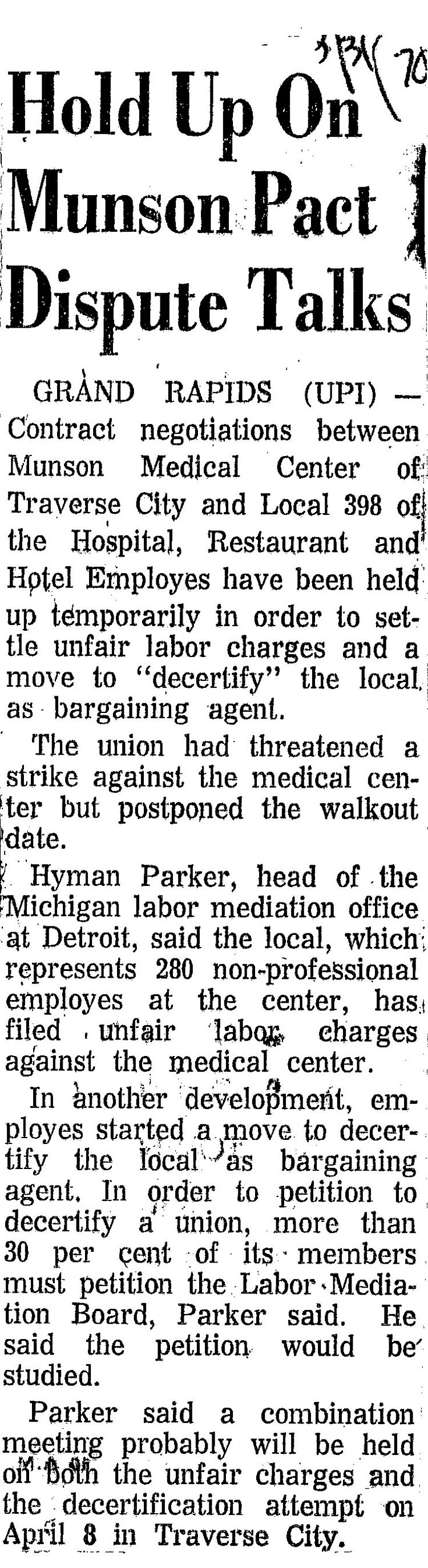 Newspaper article. Unfair labor charges and a move to decertify have held up contract negotiations. The union has threatened a strike but have postponed a walk-out date.