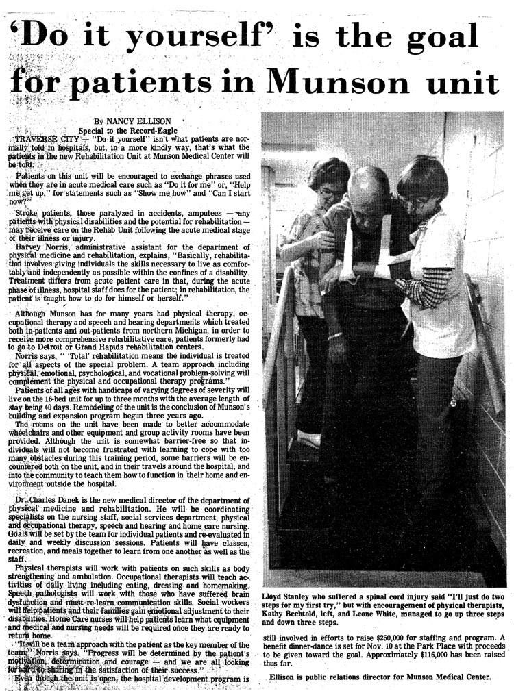 Newspaper article with photograph of Lloyd Stanley who suffered a spinal cord injury said "I'll just do two steps for my first try," but with encouragement of physical therapists, Kathy Bechtold, left, and Leone White, Llyod managed to go up three steps and down three steps. Patients receive physical therapy.