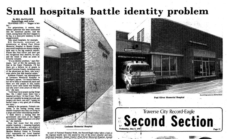 Newspaper article with photographs of: top-left, Leelanau Memorial Hospital; Paul Oliver Memorial Hospital; top-right; Bruce Huron, Kathleen Putnam, Bill Hermann and Jack Bay. Small hospitals often lack recognition in the communities they serve. Paul Oliver Memorial Hospital and Leelanau Memorial Hospital reflect on relationship with Munson.