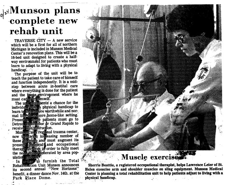 Sherrie Beattle, a Registered Occupational Therapist, helps Lawrence Leier, of St. Helen, to exercise his arm and shoulder muscles using sling equipment. Munson Medical Center's renovation plans include a 16-bed Rehabilitation Unit. The unit is a mid-step between acute in-hospital care and the home environment.