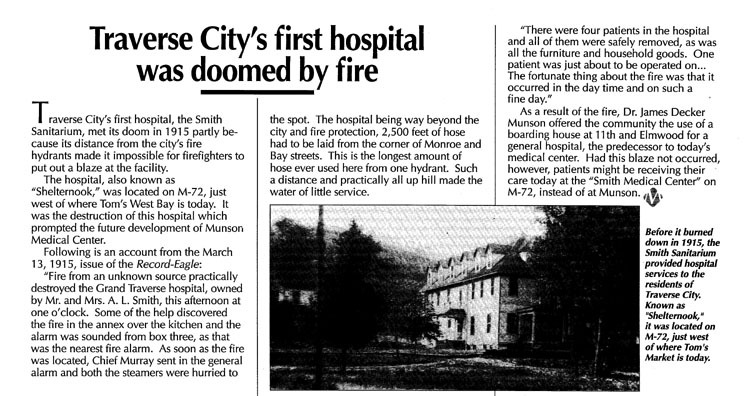 Article in quarterly newsletter with photograph of the Smith Sanitarium, known as the "shelternook", located on M-72, just west of where Tom's Market is today (1990). Traverse City's first hospital, the Smith Sanitarium, met its doom in 1915. Open heart surgery program started July 1, 1990.