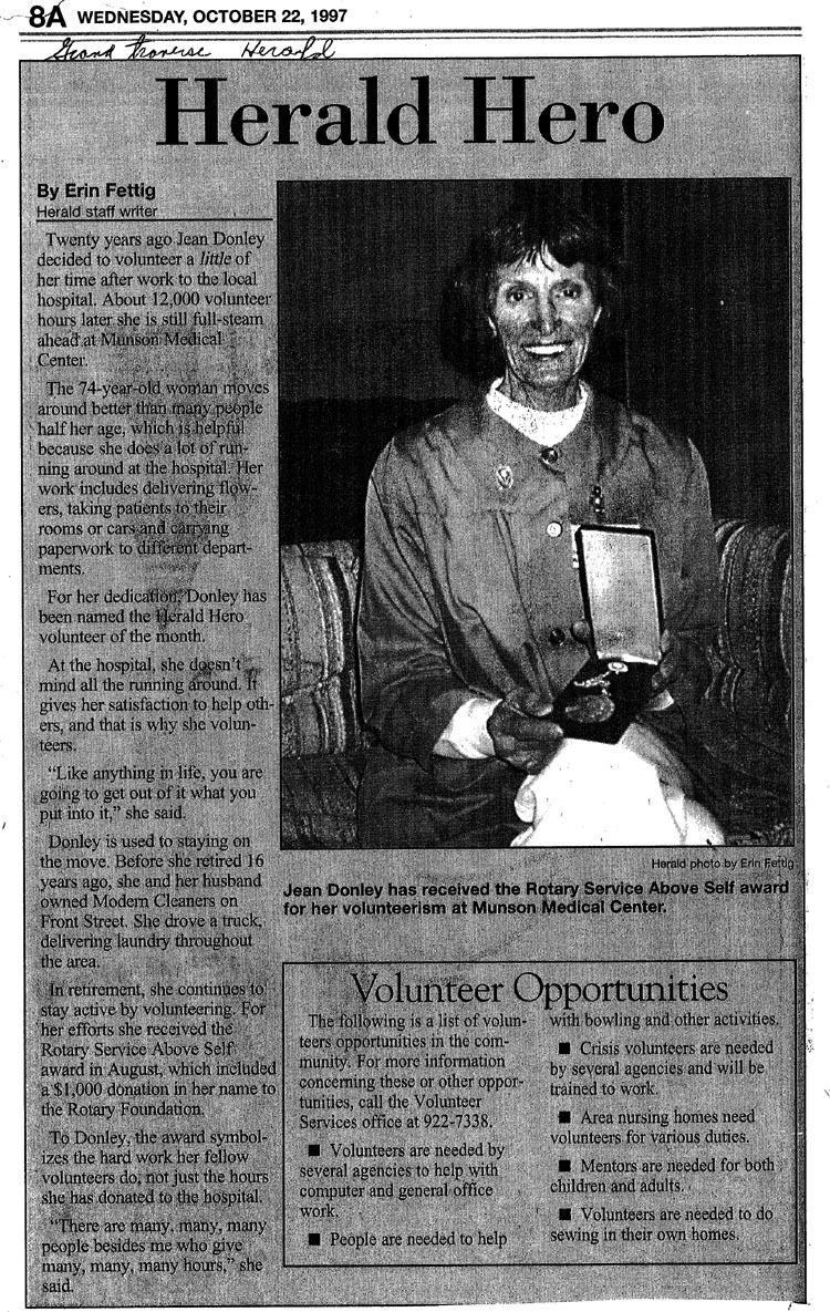 Newspaper article with photograph of Jean Donley with the Rotary Service Above Self award for her volunteerism at Munson Medical Center. Munson Medical Center volunteer logs 12,000 hours of service.