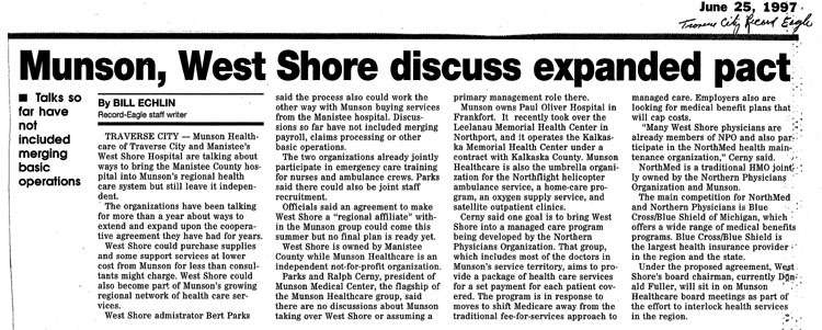 Newspaper article. Munson Healthcare and Manistee's West Shore Hospital talk about collaboration.