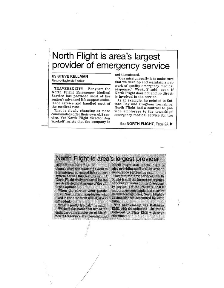 Newspaper Article with Text. For Years, the North Flight Emergency Medical Service has Provided Most of the Region's Advanced Lif North Flight is Still the Largest Emergency Services Provider in the Five-County Region.