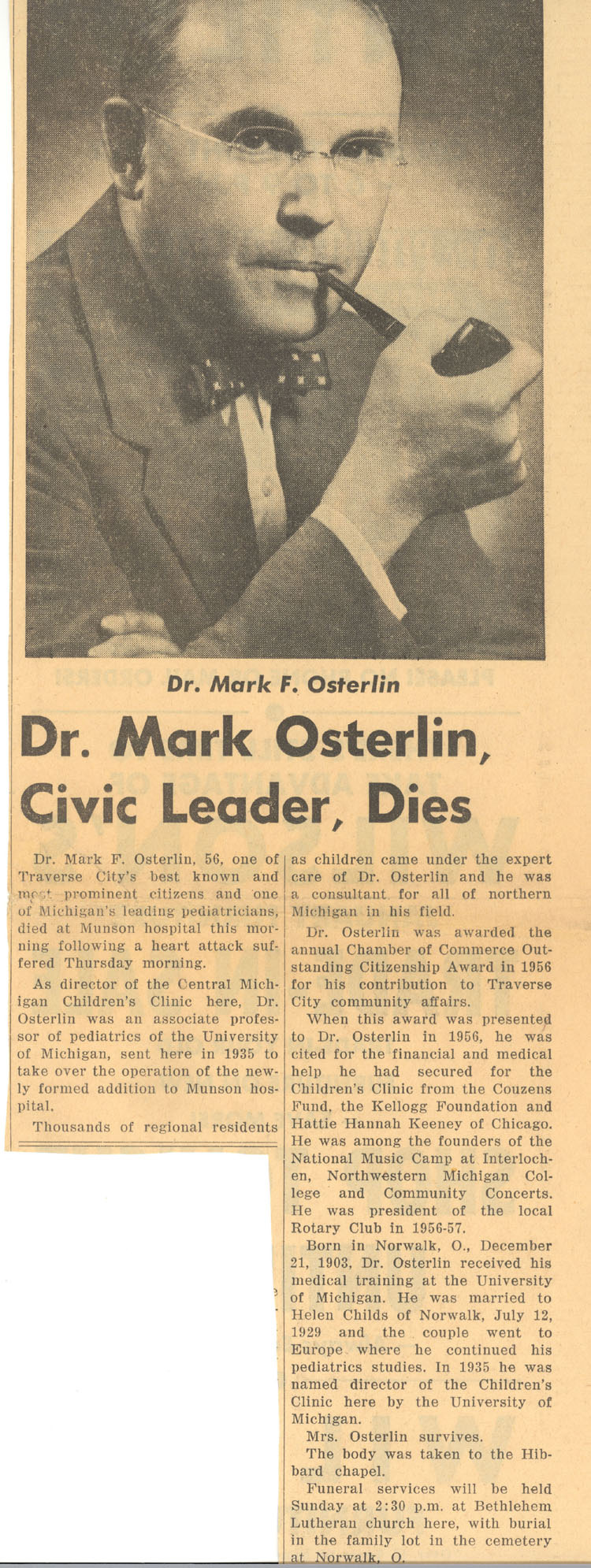 Newspaper article and photo. Dr. Mark Osterlin, 56, one of Traverse City's best known and prominent citizens of Michigan. Physician served as the Director of Munson's Children's Clinic.