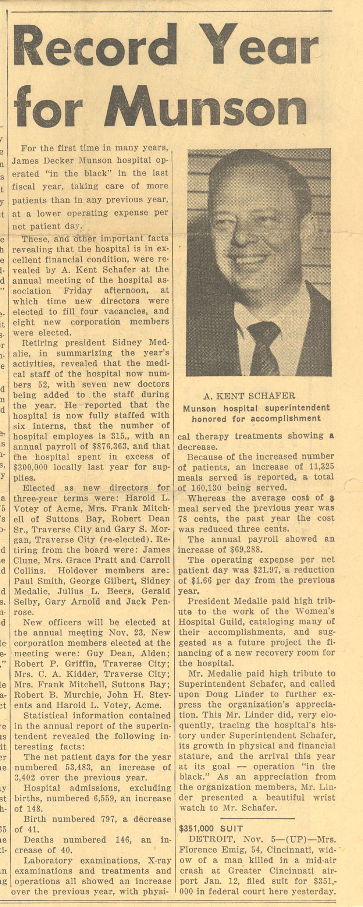 Newspaper article with photograph of Munson Hospital Superintendent A. Kent Schafer in Traverse City, Michigan. Munson Hospital operates in the black in last fiscal year. Retiring President Sidney Medalie contributed to excellent financial condition.