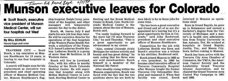 Newspaper article. Scott Bosch, Exectutive President of Munson Medical Center, will run four hospitals.
