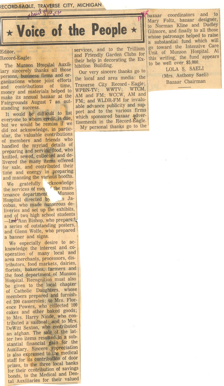 Newspaper letter to the editor. Sponsored by the Munson Hospital Women's Auxiliary to equip the intensive care unit.