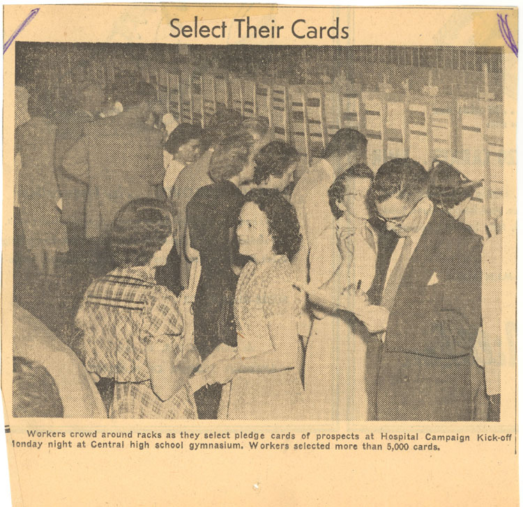 Newspaper photograph showing workers gathering to select the pledge cards of prospects at the Central High School gymnasium. Workers selected more than 5,000 cards.