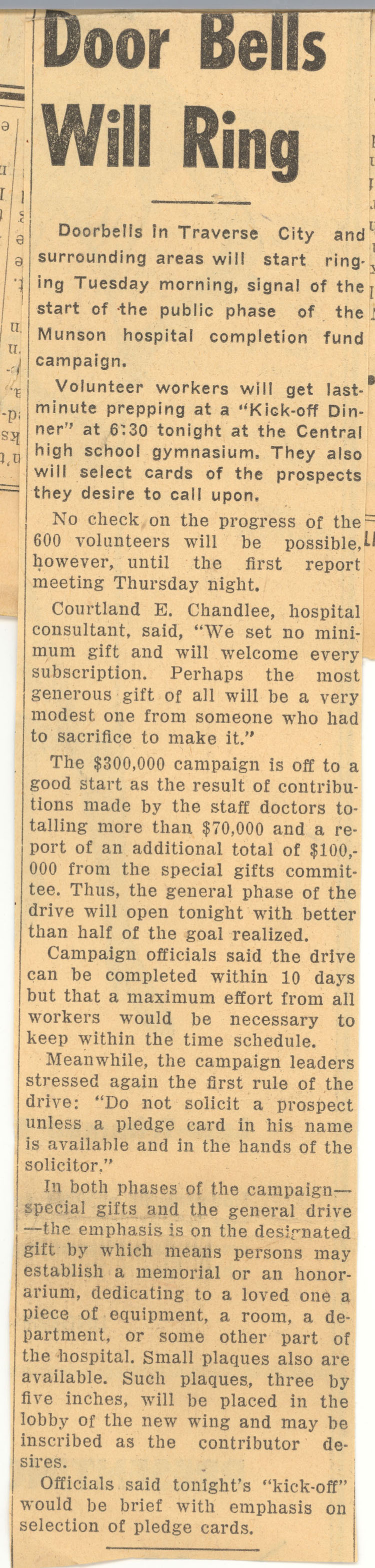 Newspaper article. Door bells will ring in Traverse City and surrounding areas Tuesday morning.