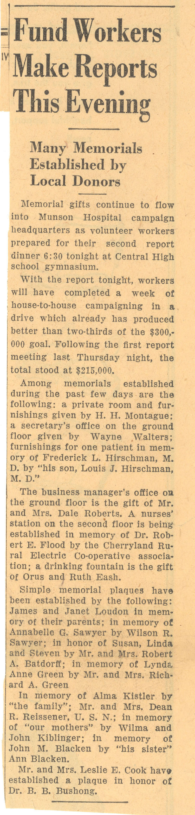 Newspaper article details the gift's source, designation and memorials. Memorial gifts continue to flow into Munson Hospital Campaign Headquarters.