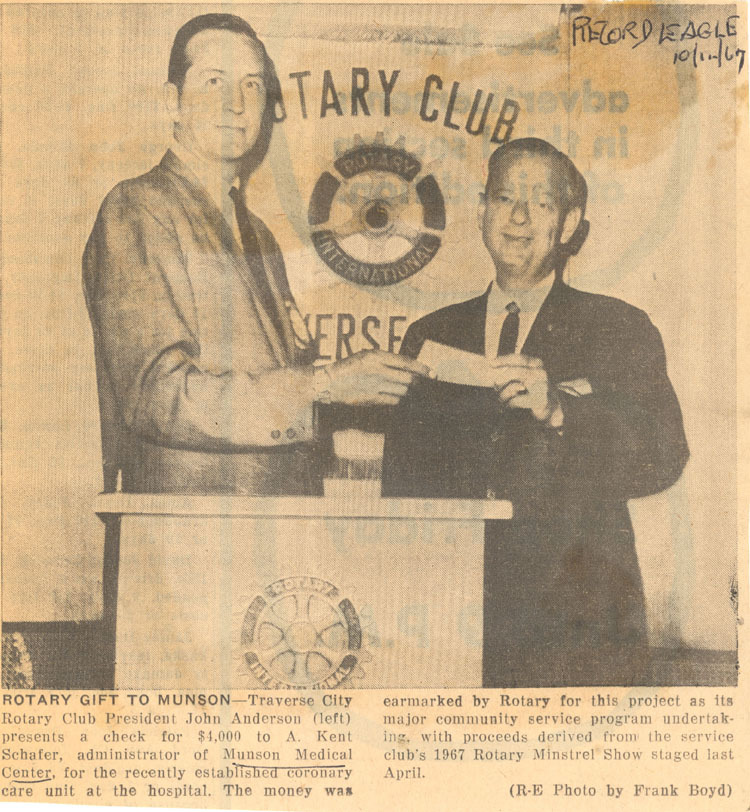 Newspaper photo includes Traverse City Rotary Club President John Anderson (left) and A. Kent Schafer, Administrator of Munson Medical Center (right). Traverse City Rotary Club President presents a $4,000 check to Munson Medical Center Administrator. Money was earmarked for the Coronary Care Unit with proceeds from the Rotary Minstrel show.