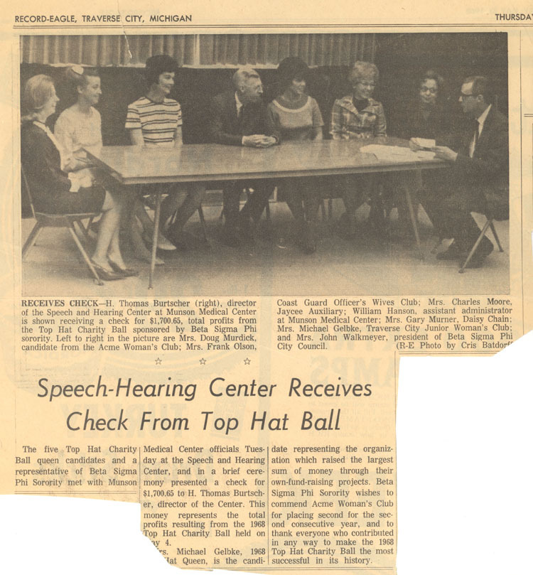 Newspaper article and photo showing from left to right: Mrs. Douglas Murdick, candidate from the Acme Woman's Club; Mrs. Frank Olson, Coast Guard Officer's Wives Club; Mrs. Charles Moore, Jaycee Auxiliary; William Hanson, Assistant Administrator at Munson Medical Center; Mrs. Gary Murner, Daisy Chain; Mrs. Gelbke, Traverse City Junior Women's Club; and Mrs. John Walkmeyer, President of Beta Sigma Phi City Council; along with H. Thomas Burtscher, Director of the Speech and Hearing Center at Munson Medical Center. Five Top Hat Charity Ball queen candidates and a representative of Beta Sigma Phi Sorority.
