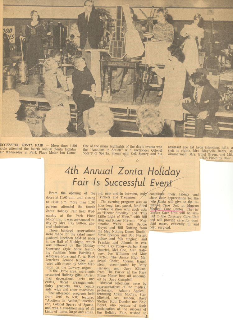 Newspaper article with photograph taken at the "Auctions in Action" event. Pictured are auctioneer Colonel Sperry of Sparta, his assistant, Ed Lyon (left); and below (left to right) Mrs. Marybelle Beers, Mrs. Dawn Zimmerman, Mrs. Ethel Green, and Mike Dively. Traverse City Zonta Club's 4th Annual Holiday Fair where more than 1,500 people attended the event. Sponsored by the Munson Hospital Women's Auxiliary to equip the intensive care unit.